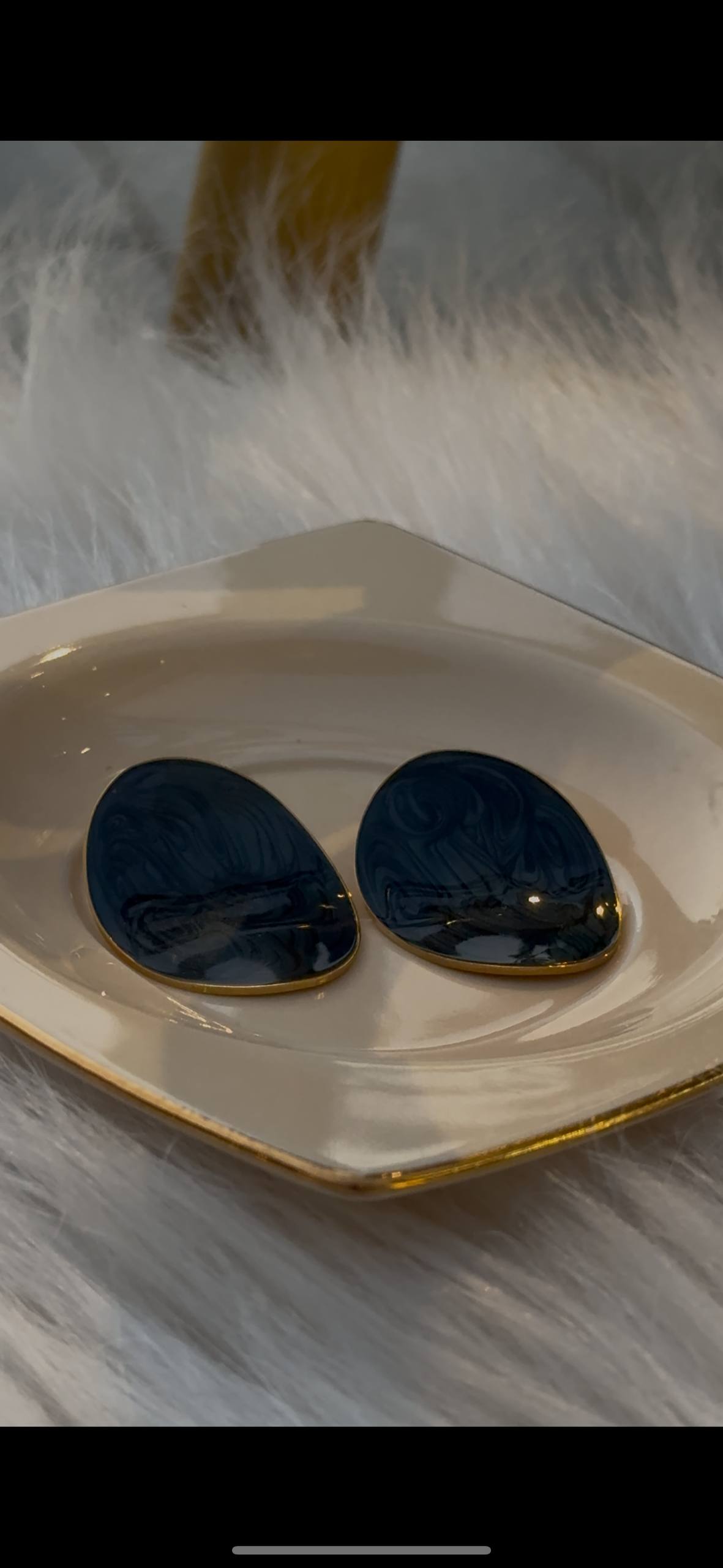 حلق على شكل بيضاوي أنيق، واحدة باللون الأسود اللامع لمسة ناعمة. الحلقان تحتوي على مربعات سوداء مزينة بتفاصيل ذهبية مُلمعة، مما يعطي لمسة عصرية وجريئة للتصميم.